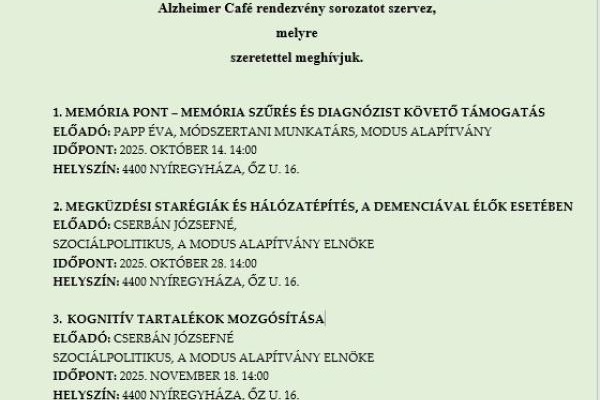 A Nyíregyházi Szociális Gazdálkodási és Egészségügyi Alapellátási Központ Alzheimer Café rendezvény sorozatot szervez, melyre szeretettel meghívjuk.