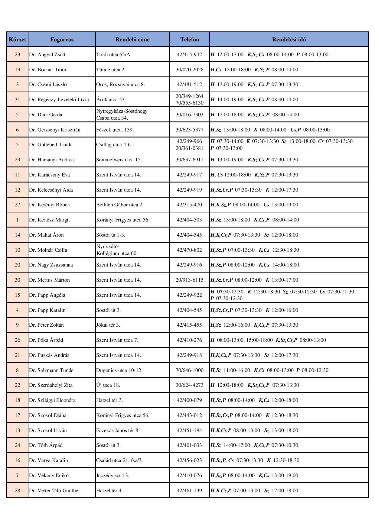 | 20 | 1. | dr. Kertész Margit | Sipkay Barna utca | 4400 Nyíregyháza, Korányi Frigyes utca 56. |
